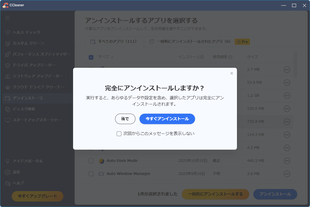 「完全にアンインストールしますか?」メッセージが表示されるので「今すぐアンインストール」ボタンをクリックします。