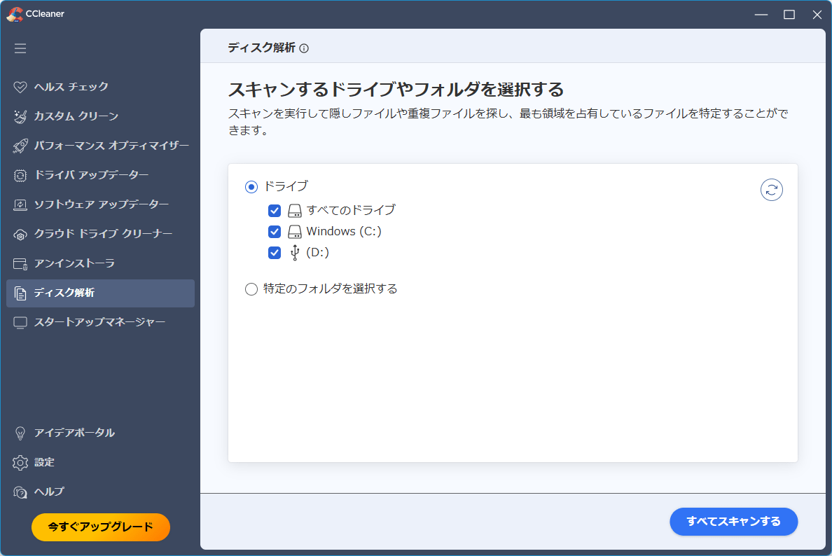 不要な重複ファイルを削除することで空き領域を増やします。スキャンするドライブやフォルダーを選択して「すべてスキャンする」ボタンをクリックします。