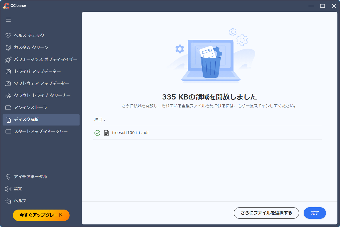 すべてのステップでスキップやクリーニングが終わると完了画面が表示されるので、「完了」ボタンをクリックします。
