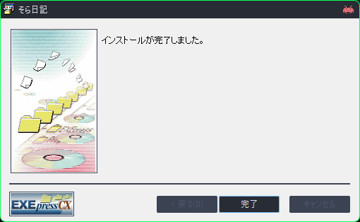 知識不足で申し訳ないですが、このアプリを使う上で不明瞭な点があったので質問させていただきます。 このサイトに記載している手順通り、公式HPの左欄にある「そら日記 -SS -DL」の箇所からDLさせていただきました。 DLしたファイルを起動して、画像の画面でフォルダーの指定を行った後、インストール?を行ったのですが、すぐにファイルが閉じてしまいます。 「デスクトップ上にショートカットを作成する(D)」というチェックボックスにチェックを入れたのですが、デスクトップ上にそれらしきショートカットが現れず、指定したフォルダーを探してもファイルが見つかりません。 このような経緯で、パスワードと復活の呪文を設定する段階にたどり着けないです。 分かりにくい説明ですが、どうすればいいか教えてほしいです。 お忙しい中恐れ入りますが、アドバイス頂ければ幸いです。
