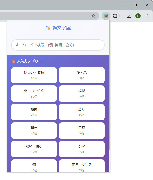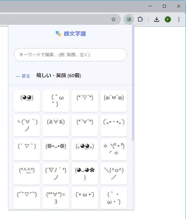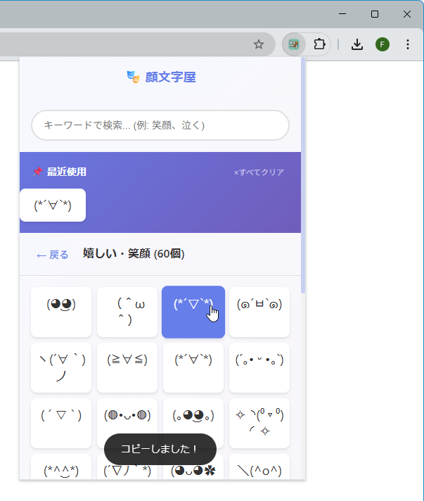 顔文字を使いたいときに、すぐ呼び出して利用できる Chrome 拡張機能です。