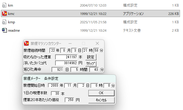 禁煙開始日時、1日の喫煙本数、煙草20本当たりの値段を設定すると、禁煙継続時間、吸わなかった煙草の本数、浮いたタバコ代、伸びた寿命を表示します。