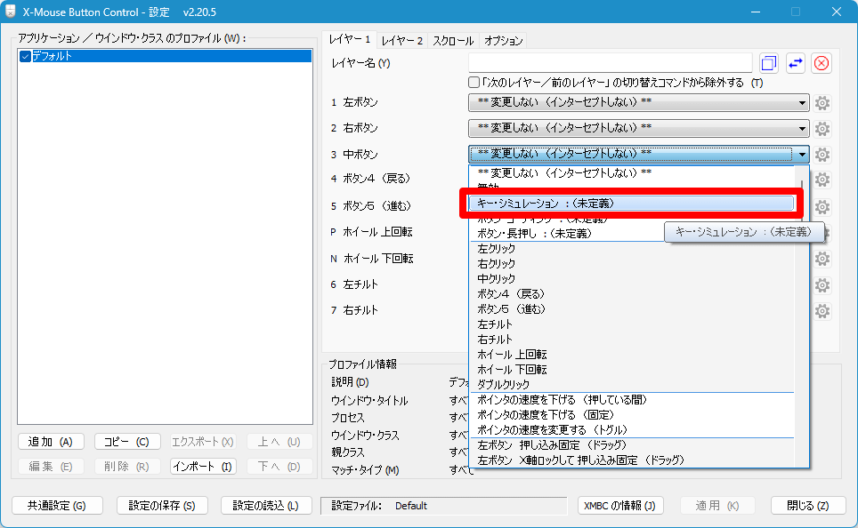 - X-Mouse Button Control を起動してメイン画面を開き、中ボタン項目の「** 変更しない(インターセプトしない)**」プルダウンをクリックして「キー・シミュレーション(未定義)」をクリックします。