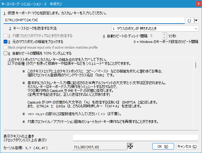 ※ 日本語化設定や基本的な使い方は X-Mouse Button Control にてご確認ください。 - 「キーストローク・シミュレーション」画面が開くので、一番上のテキストボックスに以下のように入力します。