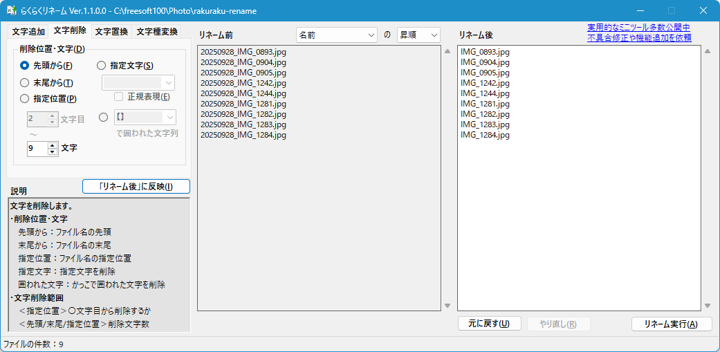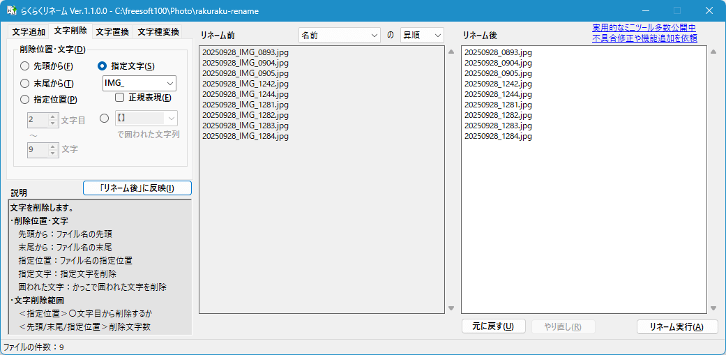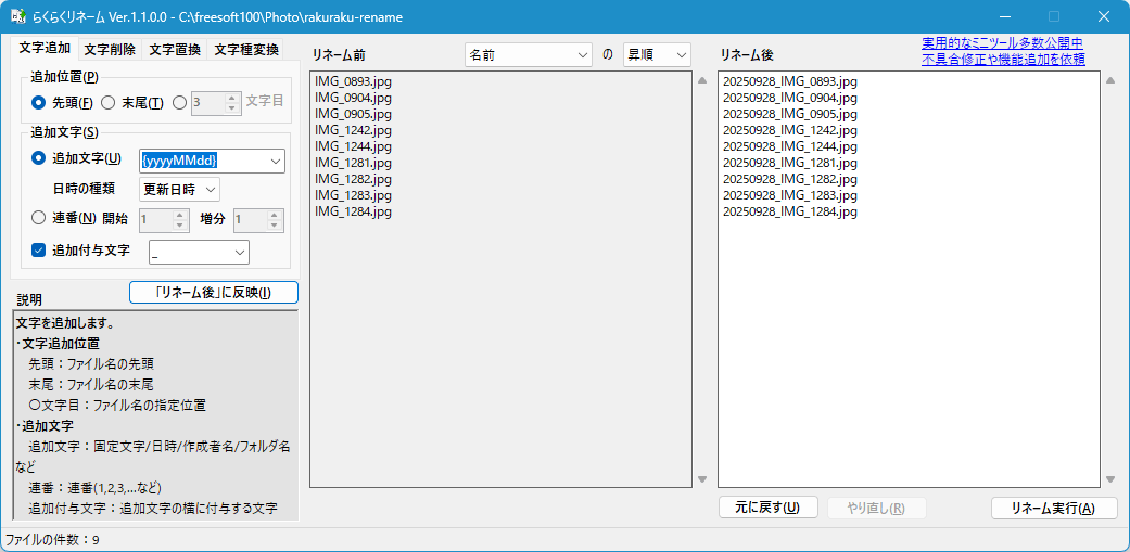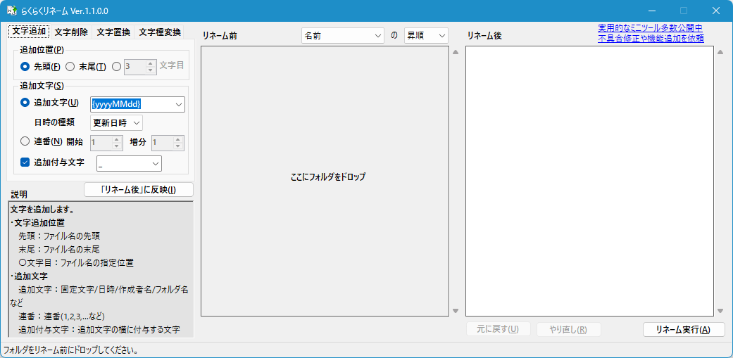 文字の追加、削除、置換など多彩なリネームを行える、複数ファイルの一括リネームに対応したソフトです。