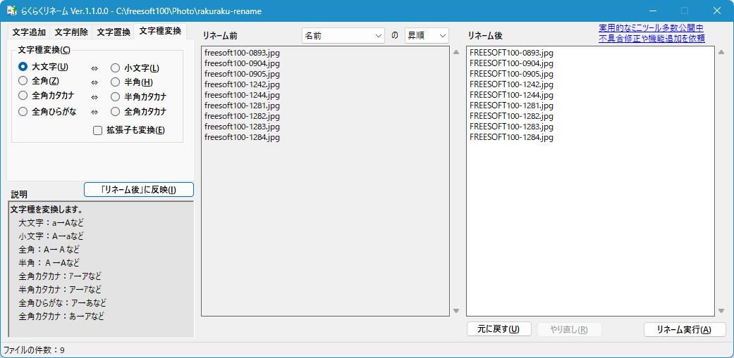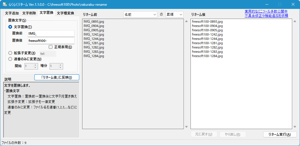 「置換前」に入力した文字列を「置換後」に入力した文字列に置き換えます。 - 拡張子変更