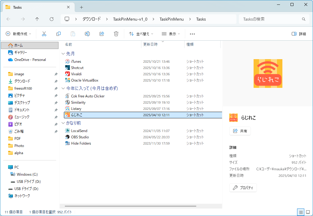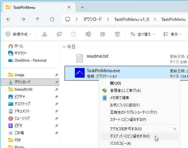 - ダウンロードした圧縮ファイル(TaskPinMenu-v1_1.zip)を展開して利用します。