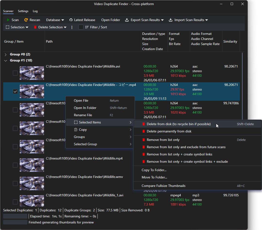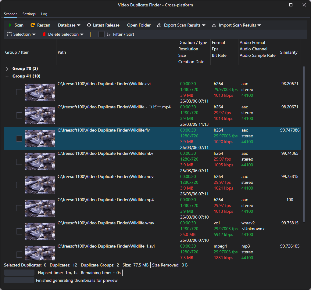スキャンが終わると、重複・類似している動画や画像をリスト表示し、それぞれ次の内容を表示します。