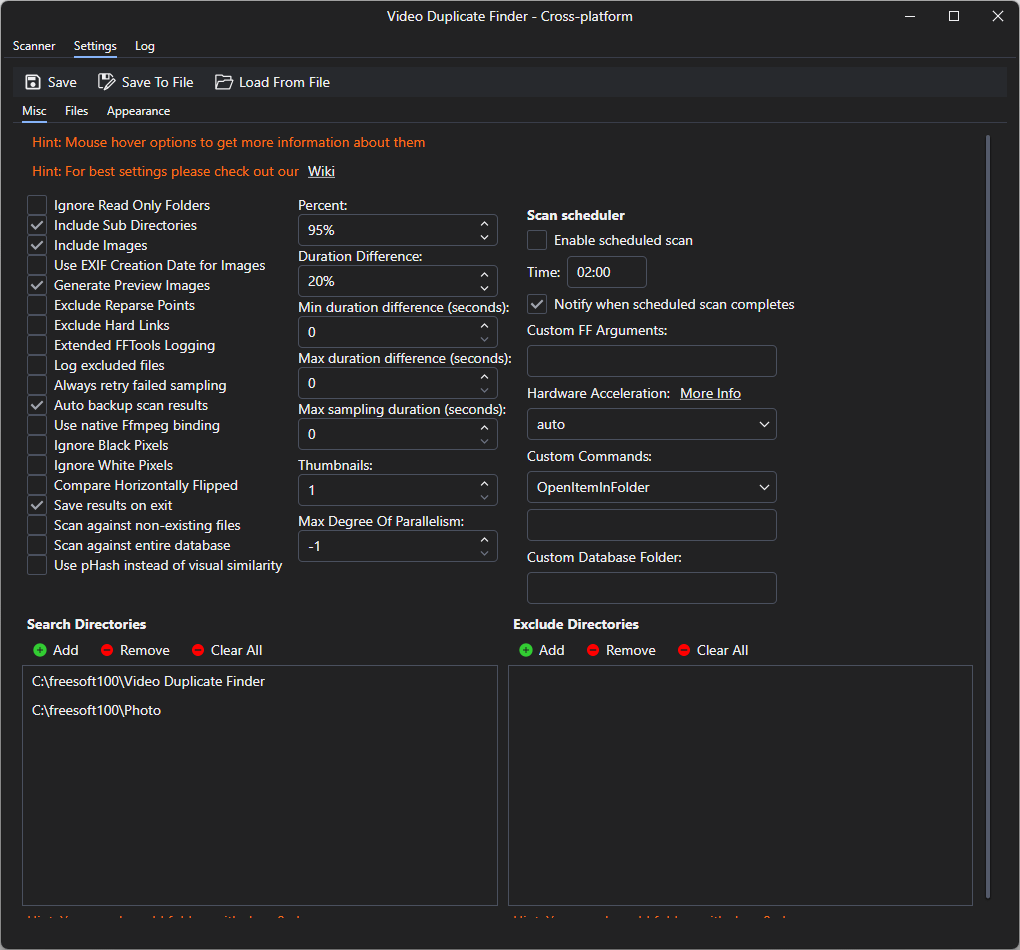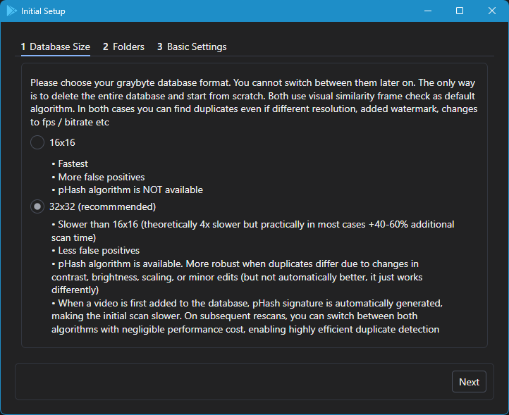 ビデオがデータベースに最初に追加される際に、pHash シグネチャが自動的に生成されるため、最初のスキャンは遅くなります。その後の再スキャンでは、パフォーマンスコストを無視できる程度の両方のアルゴリズムを切り替えることができ、非常に効率的な重複検出が可能です。
