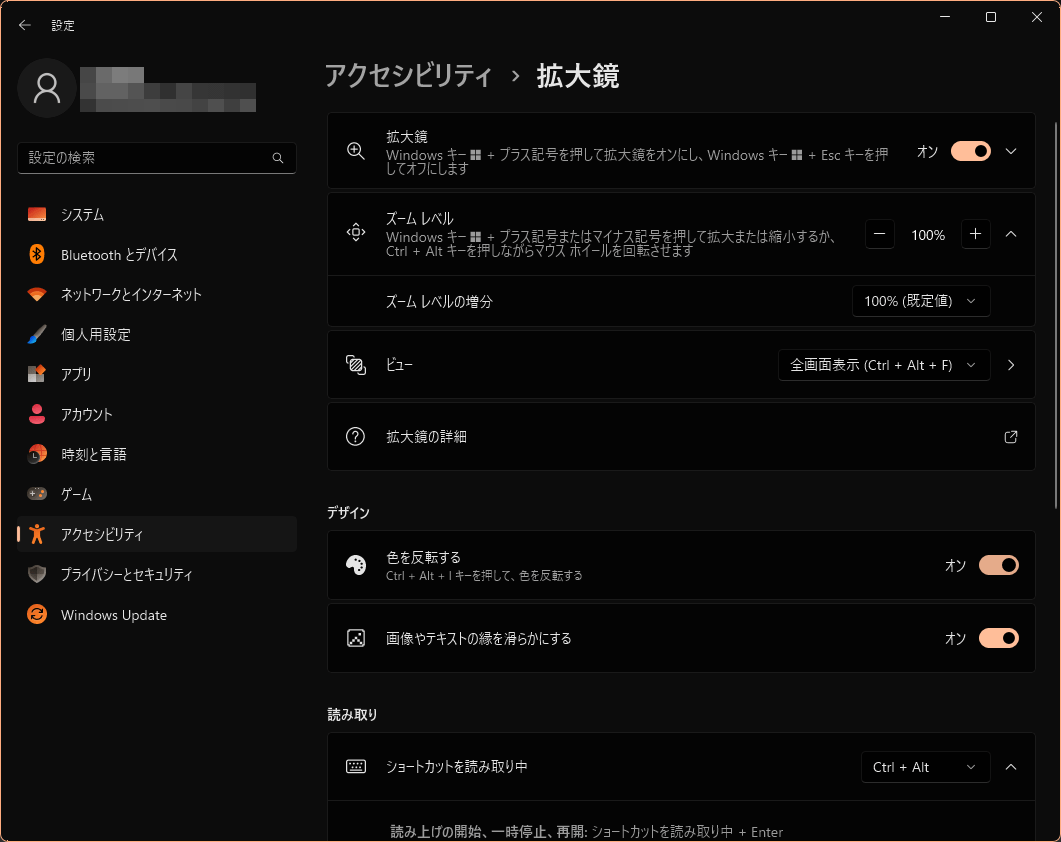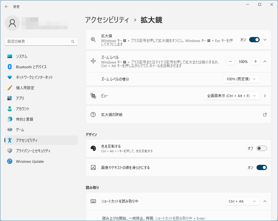 Windows + Ctrl + M キーを押すと、本ソフトの設定画面が表示されます。- Windows 11 の場合:Windows の設定画面から「アクセシビリティ」⇒「拡大鏡」とクリックしても表示できます。